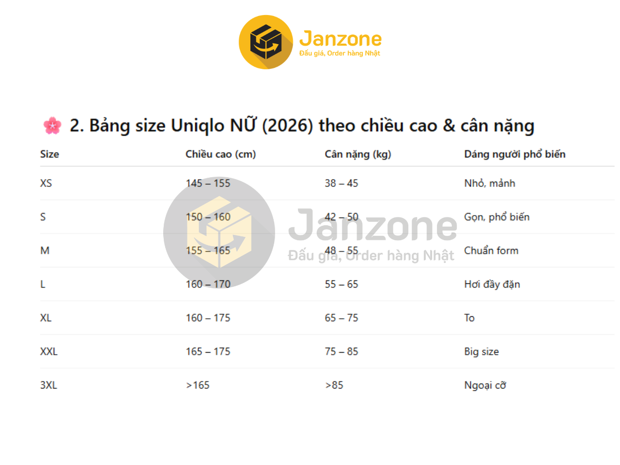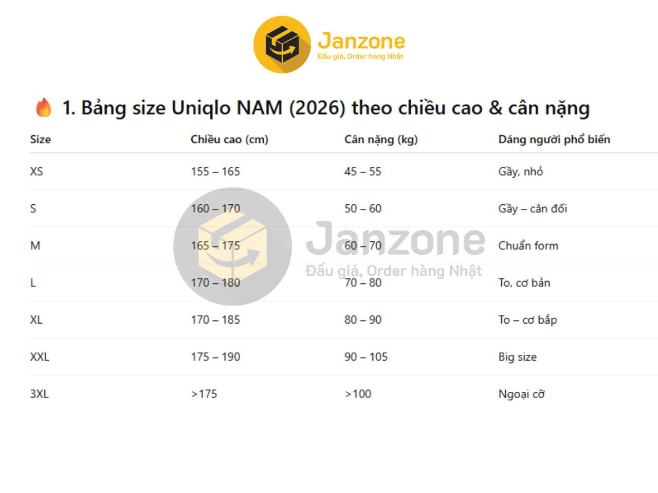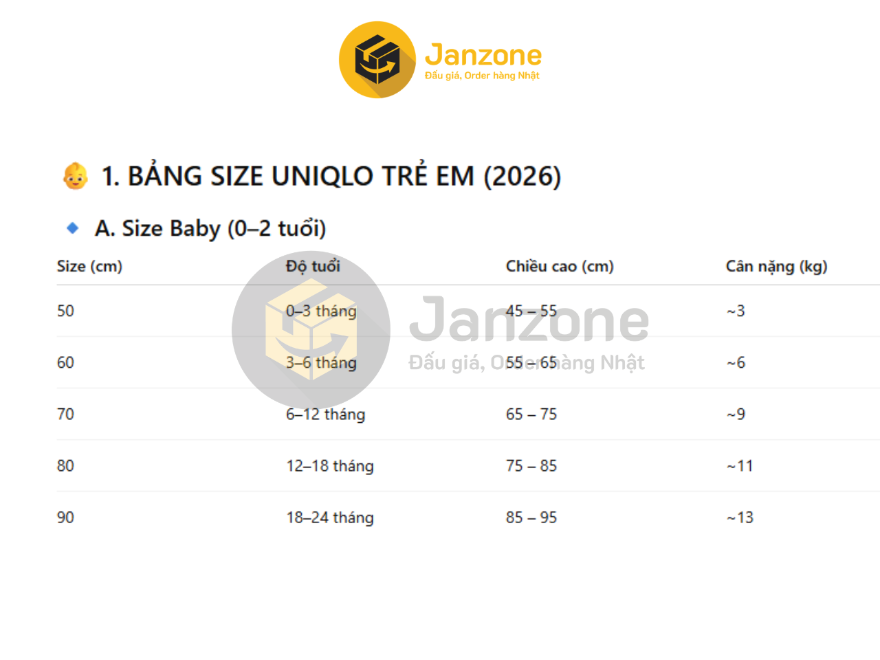 Rất nhiều khách hàng lựa chọn mua sắm quần áo Uniqlo Nhật bởi có sự tương đồng giữa bảng dáng người đậm chất châu Á. Tuy nhiên, khách hàng vẫn nên kiểm tra kĩ bảng size trước khi ra quyết định mua sắm, tránh lãng phí do không mặc vừa. Dưới đây là một số bảng size (đã được dịch ra Tiếng Việt) mà Janzone đã tổng hợp được, quý khách hàng có thể tham khảo và lưu lại: