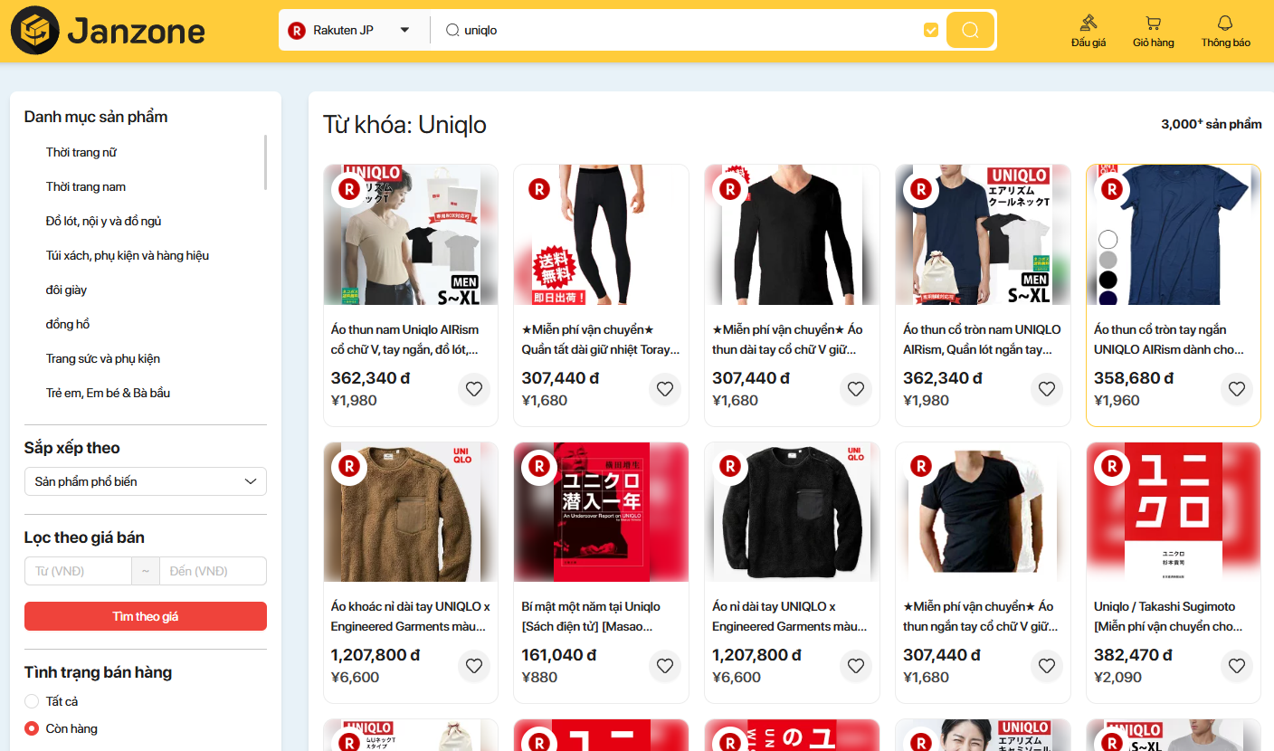 Janzone.com hiện đang cung cấp dịch vụ mua hộ, đấu giá hàng ngàn sản phẩm nội địa Nhật bao gồm quần áo thời trang đến từ thương hiệu Uniqlo cùng hàng trăm thương hiệu nội địa Nhật khác. Trải nghiệm ngay việc mua sắm hàng Nhật đơn giản nhanh chóng ngay hôm nay cùng Janzone!